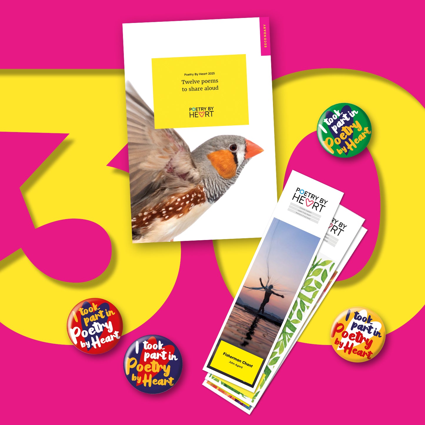 A special offer bundle of 30 medium badges in mixed colours, 30 bookmarks and 30 copies of the 2025 edition of the secondary poem booklet. Lots of treats to share and celebrate your in-school Poetry By Heart competition or event. Save £17.