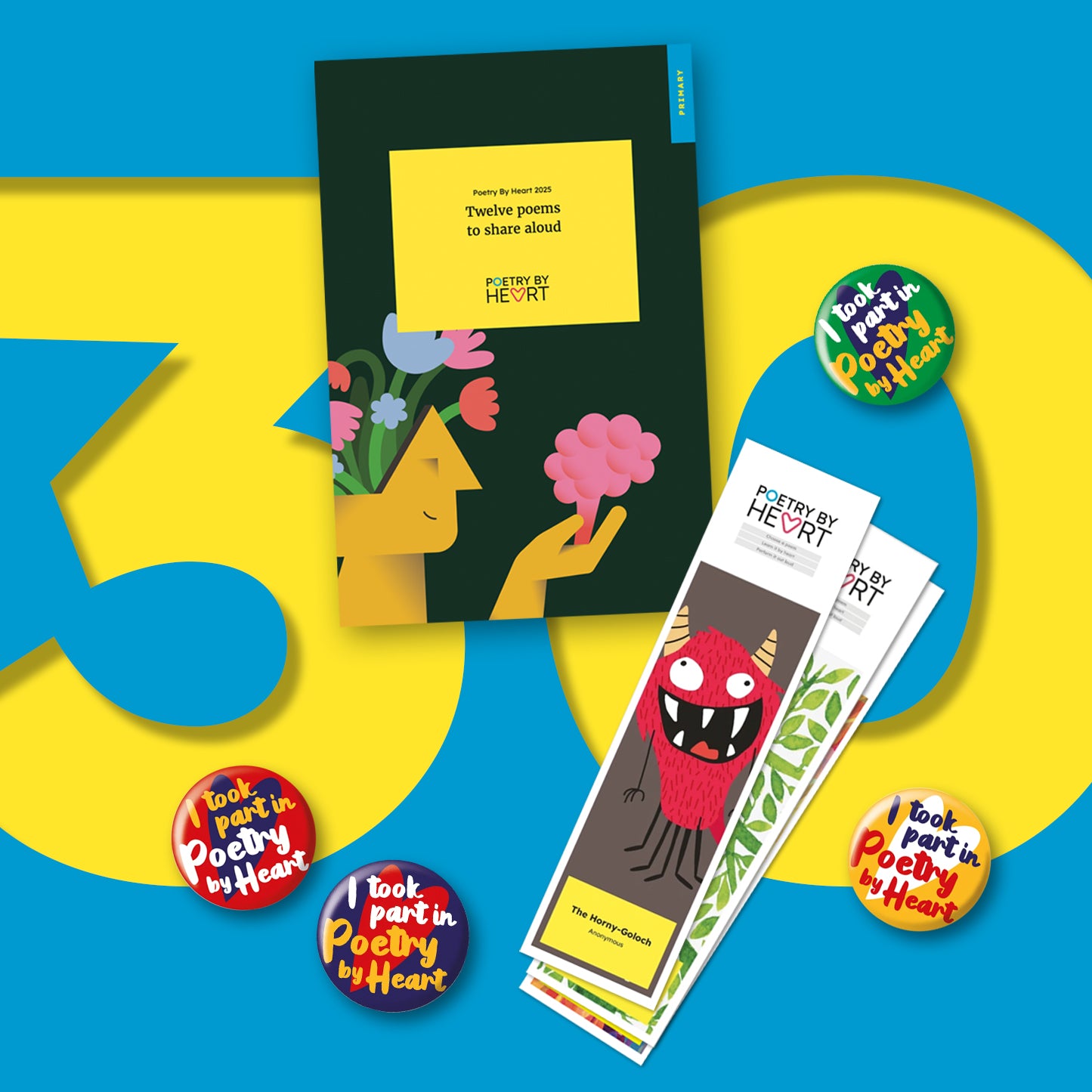 A special offer bundle of 30 medium badges in mixed colours, 30 bookmarks and 30 copies of the 2025 edition of the primary poem booklet. Lots of treats to share and celebrate your in-school Poetry By Heart competition or event. Save £17!