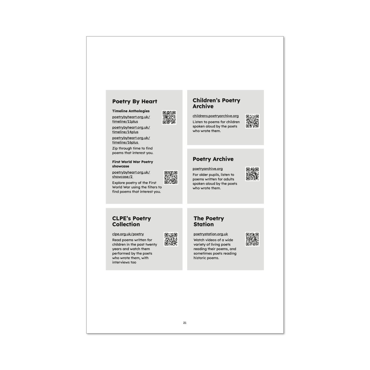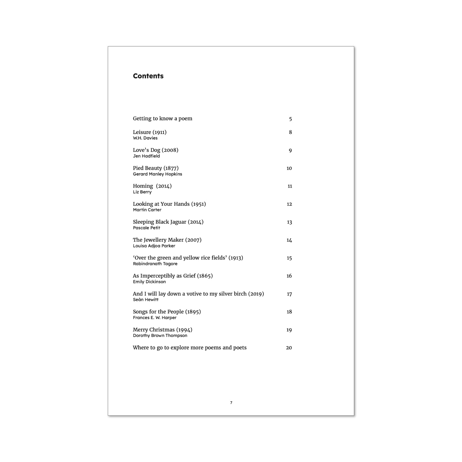 We've gathered the 12 poems from the 2025 Poetry By Heart Secondary calendar into a handy A5 booklet. Keepsakes from the 2025 competition, resources for classroom or library, or a mini-anthology to choose poems from - we're sure it'll have lots of different uses! Each poem comes with a QR code - zap it to find the poem in one of the Poetry By Heart timeline anthologies and to explore extra resources online. There are also handy tips on how to learn a poem by heart and where to find other great poetry resources. Includes poems by W.H. Davies, Jen Hadfield, Gerard Manley Hopkins, Liz Berry, Martin Carter, Pascale Petit, Louisa Adjoa Parker, Rabindranath Tagore, Emily Dickinson, Sean Hewitt, Frances E.W. Harper and Dorothy Brown Thompson. Suitable for Secondary age pupils.
